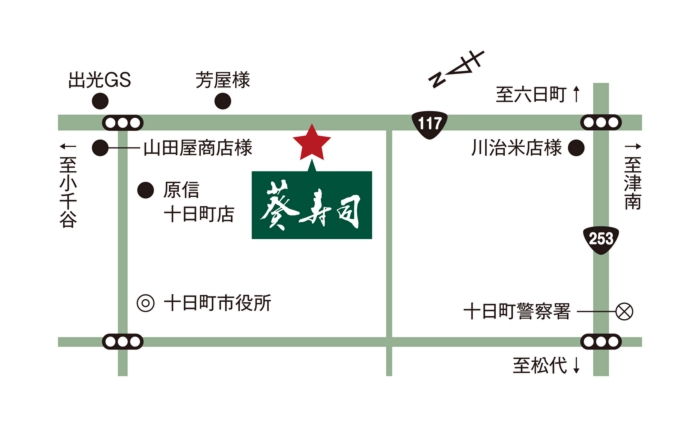 六日町方面…R253号線より山本町の交差点を右折、R117号線を直進 約300m左手